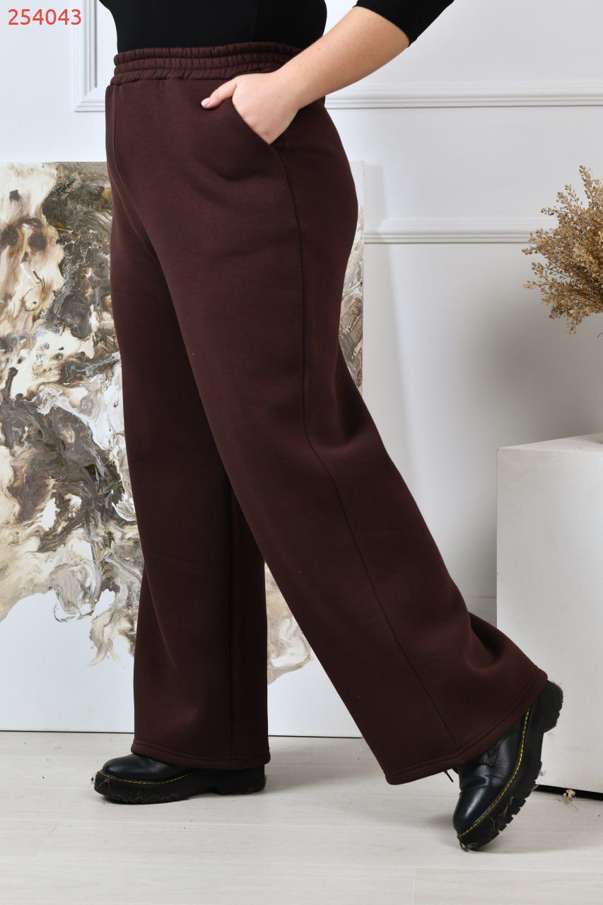 Стильні прямі широкі брюки-палаццо виготовлені з якісного трикотажу тринитка з начосом, що забезпечує середню розтяжність матеріалу та комфорт під час носіння. Ці брюки мають посадку, яка розташована трохи вище середньої, завдяки чому вони стильно підкреслюють талію, а еластична резинка по талії додає зручності і дозволяє прекрасно підлаштуватися під фігуру. В бокових швах розташовані практичні кишені, які не тільки доповнюють дизайн виробу, але й додають функціональності й зручності в повсякденному використанні.