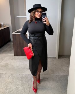 Шкіряна спідниця на запах, із завищеною талією, застібка функціональні ґудзики, також є шлевки під пояс, поясок у комплекті.