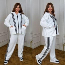 Штани з високою посадкою , пояс на гумці , бічні кишені , бічні ломпаси . Кофта з капюшоном прямого покрою на блискавці , з кишенями , низ на фіксаторі .