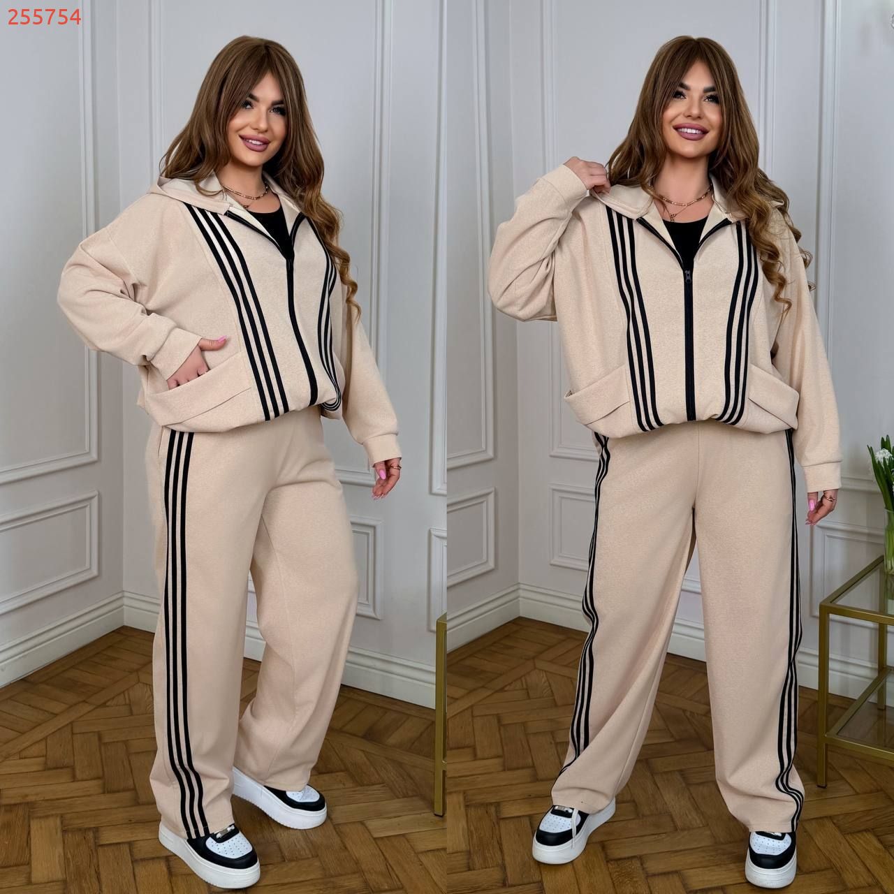Штани з високою посадкою , пояс на гумці , бічні кишені , бічні ломпаси . Кофта з капюшоном прямого покрою на блискавці , з кишенями , низ на фіксаторі .