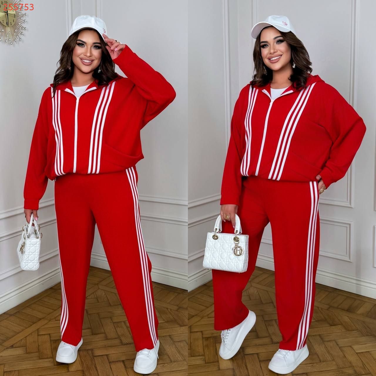 Штани з високою посадкою , пояс на гумці , бічні кишені , бічні ломпаси . Кофта з капюшоном прямого покрою на блискавці , з кишенями , низ на фіксаторі .