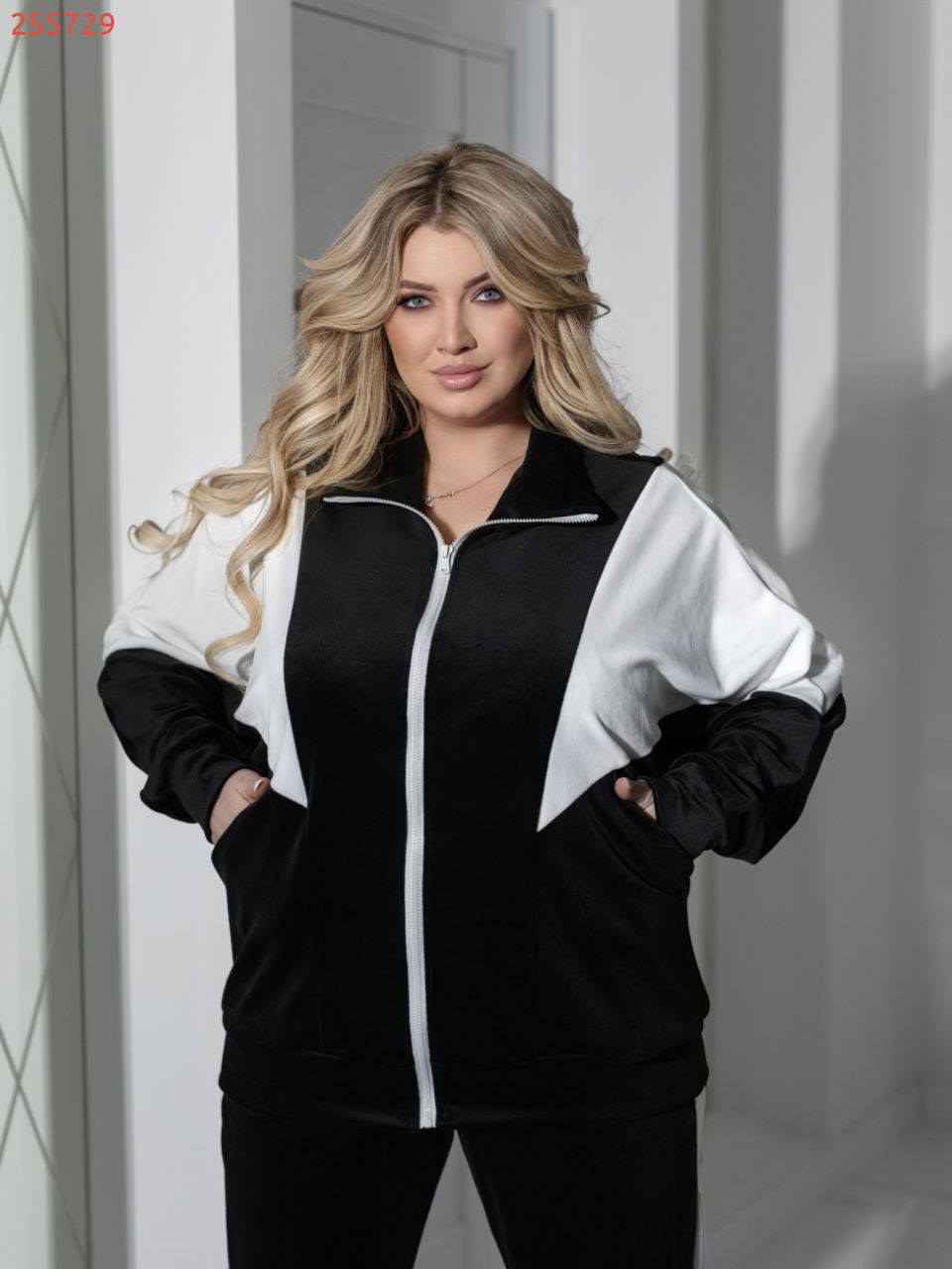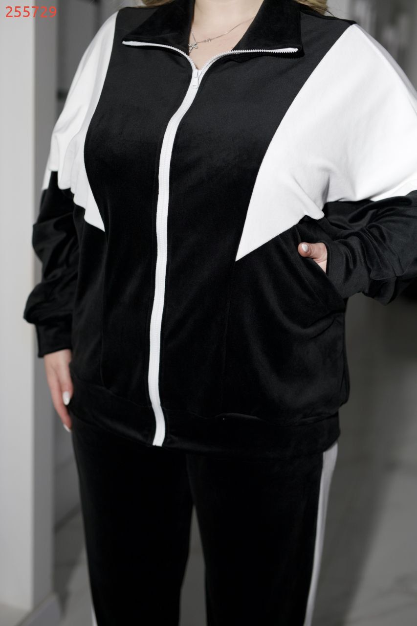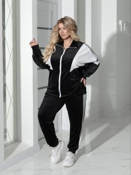 Комфортний та сучасний костюм із м'якого велюру гарної якості. Тканина приємна до тіла, гарно виглядає та має чудово розтяжність . Кофтинка вільного крою з білими вставками та з кишенями. Штани с кишенями та лампасами, низ штанів на манжетах . Костюм підійде як для прогулок так для повсякденного носіння.
