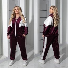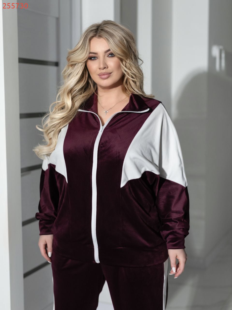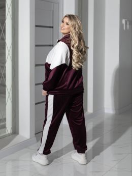 Комфортний та сучасний костюм із м'якого велюру гарної якості. Тканина приємна до тіла, гарно виглядає та має чудово розтяжність . Кофтинка вільного крою з білими вставками та з кишенями. Штани с кишенями та лампасами, низ штанів на манжетах . Костюм підійде як для прогулок так для повсякденного носіння.