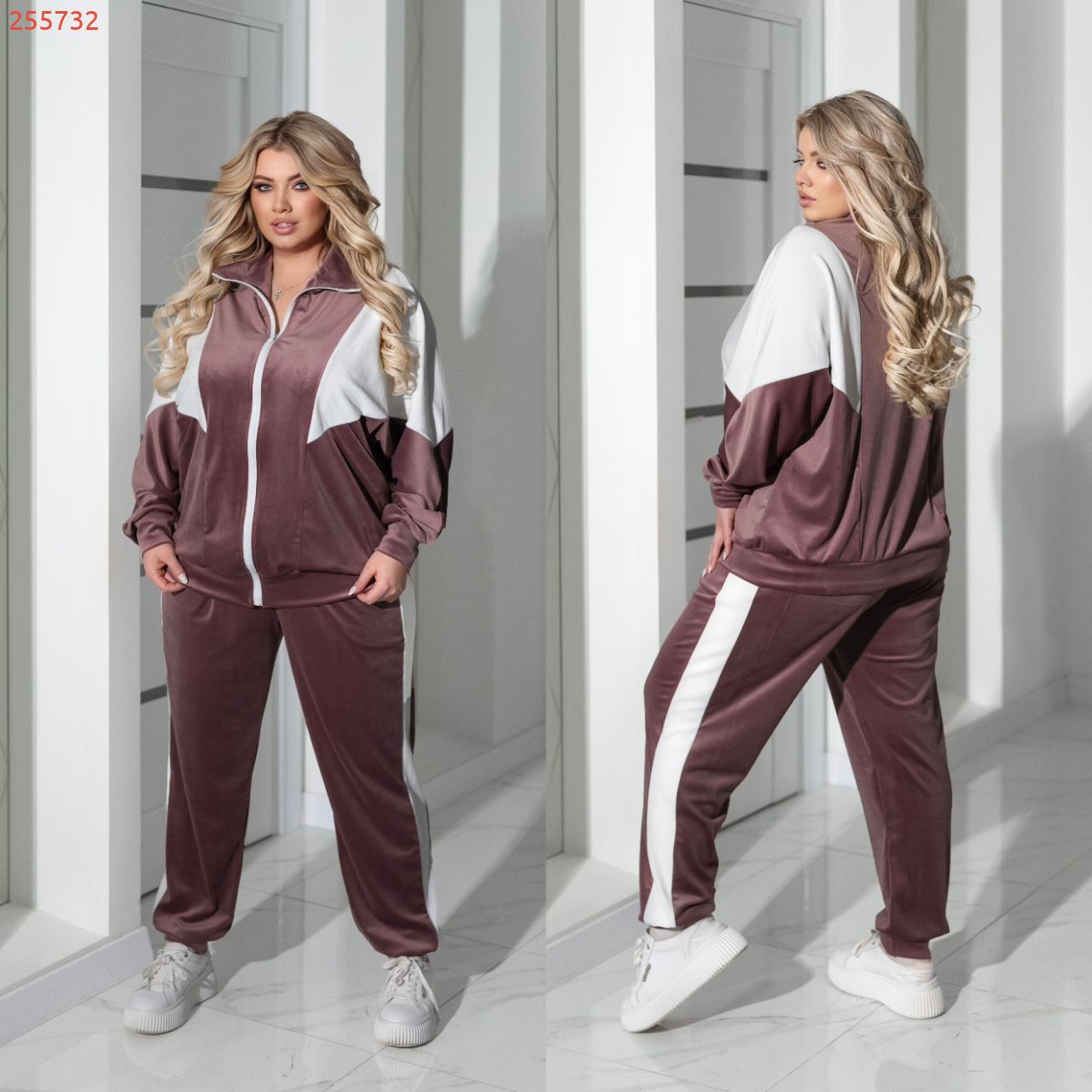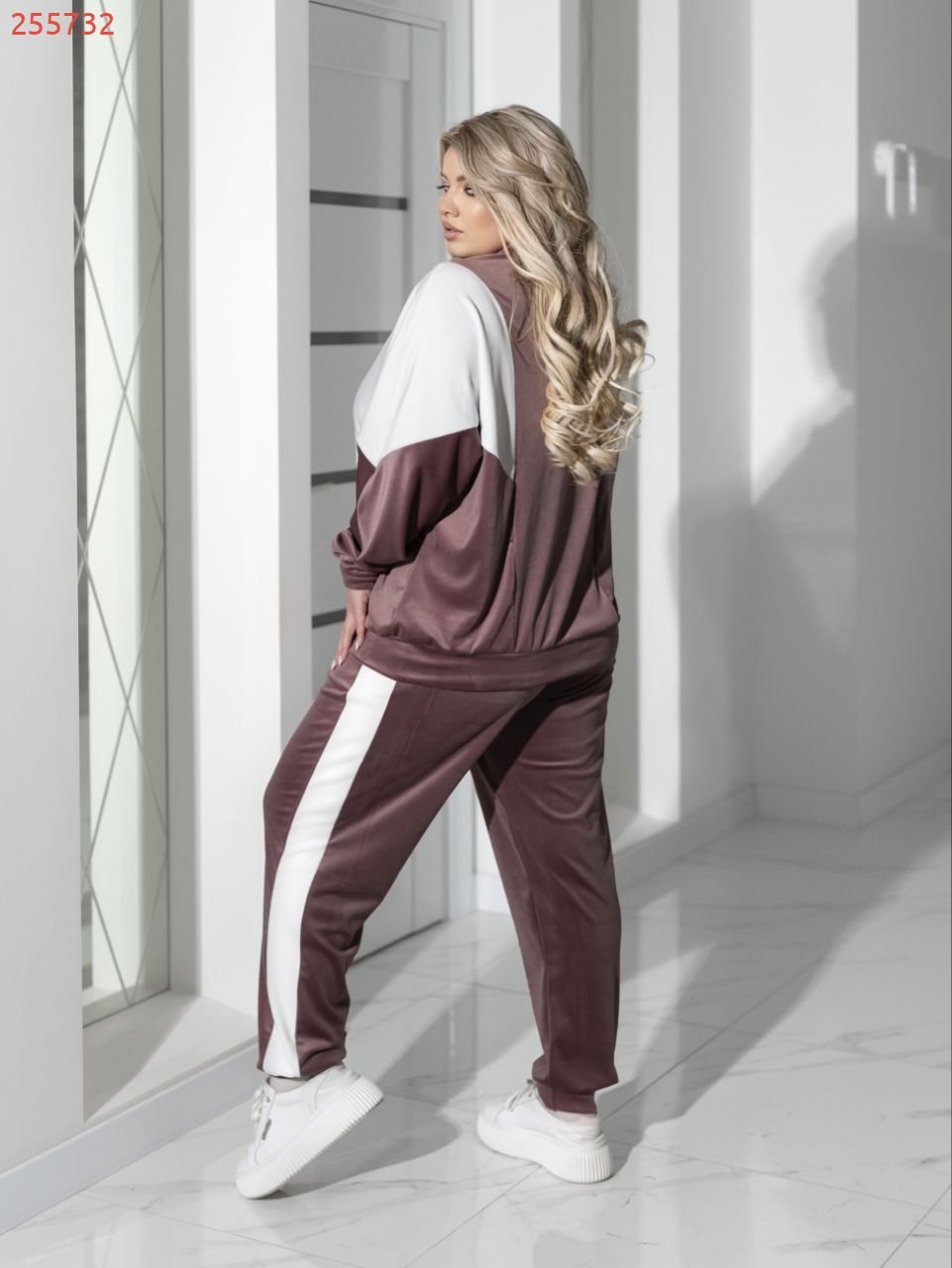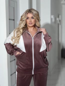 Комфортний та сучасний костюм із м'якого велюру гарної якості. Тканина приємна до тіла, гарно виглядає та має чудово розтяжність . Кофтинка вільного крою з білими вставками та з кишенями. Штани с кишенями та лампасами, низ штанів на манжетах . Костюм підійде як для прогулок так для повсякденного носіння.