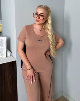 Футболка зі вставками чорної рібани по бокам ,що робить її комфортною та зменшує талію візуально.