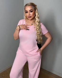 Футболка зі вставками чорної рібани по бокам ,що робить її комфортною та зменшує талію візуально.
