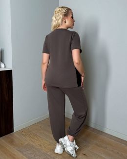 Футболка зі вставками чорної рібани по бокам ,що робить її комфортною та зменшує талію візуально.