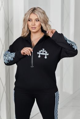 Кофтинка вільного покрою зі стійкою комірцем — зручна та сучасна. Модель декорована аплікацією з тканини, оздобленою стразами DMS, що додає образу яскравого та стильного акценту. Рукава прикрашені апплікацією, яка підкреслюють спортивний модний та сучасний стиль.