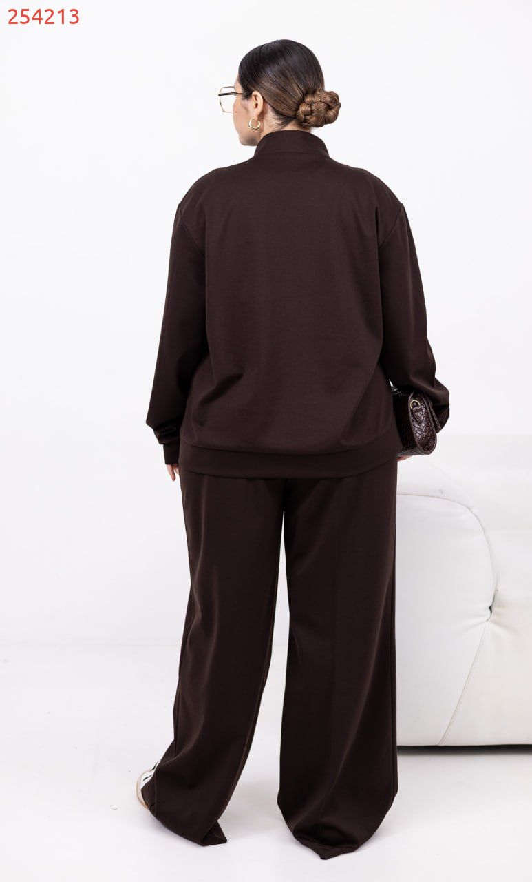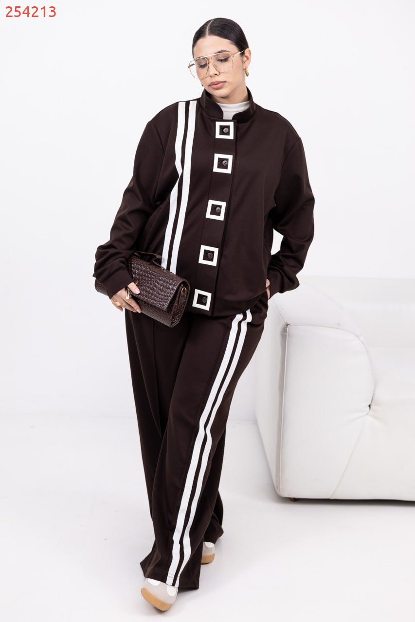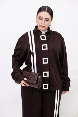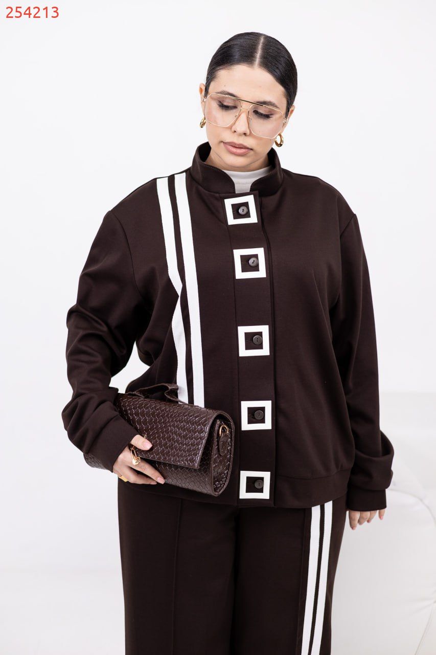 Стильний брючний костюм з еластичної тканини для тих, хто цінує баланс комфорту й елегантності. Лампаси додають динаміки, а геометричний декор (квадрат) на кофті – стильний акцент. Кофта на ґудзиках по всій довжині з прорізними кишенями. Вільні штани середньої посадки з еластичною резинкою на поясі – зручні на щодень і для поїздок.