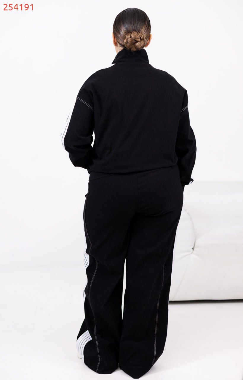 Стильний брючний костюм з еластичної тканини для тих, хто любить баланс комфорту й елегантності. Кофта та штани оздоблені лампасами: кофта на блискавці по всій довжині з прорізними кишенями та еластичним манжетом внизу. Штани середньої посадки з еластичною резинкою на поясі у стилі палаццо – витягують силует і пасують до будь-якого взуття, від кросівок до лоферів.