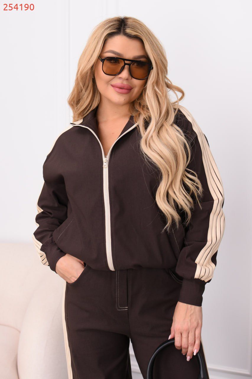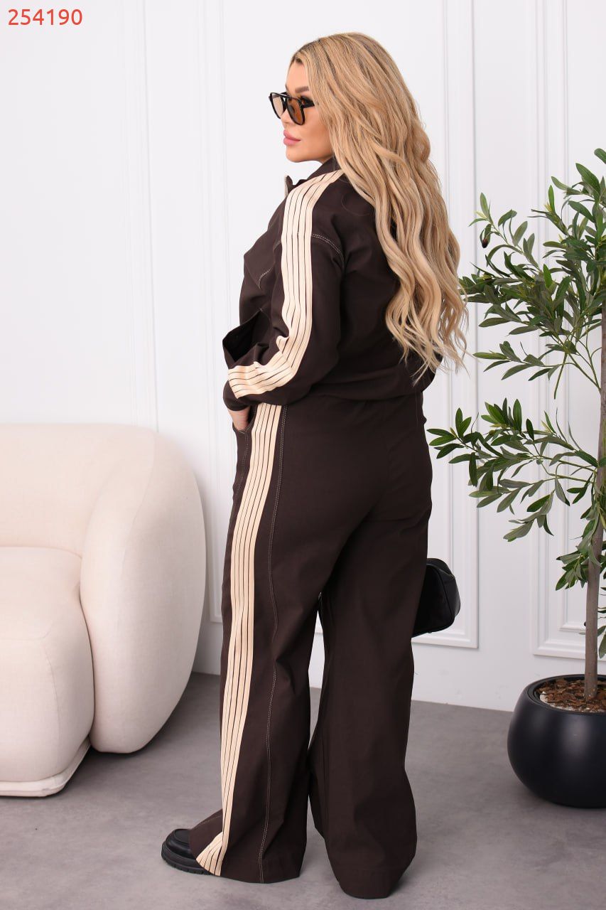 Стильний брючний костюм з еластичної тканини для тих, хто любить баланс комфорту й елегантності. Кофта та штани оздоблені лампасами: кофта на блискавці по всій довжині з прорізними кишенями та еластичним манжетом внизу. Штани середньої посадки з еластичною резинкою на поясі у стилі палаццо – витягують силует і пасують до будь-якого взуття, від кросівок до лоферів.