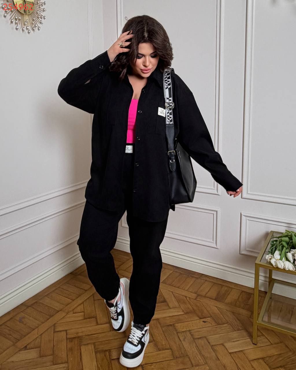 Стильний прогулянковий костюм із мікровельвету: Сорочка вільного крою на гудзиказ, з робочими кишенями + джогери з високою посадкою з кишенями у бічних швах. На поясі та знизу на гумці.