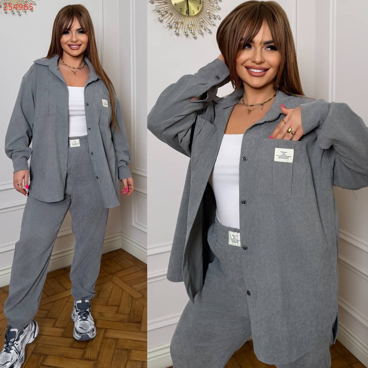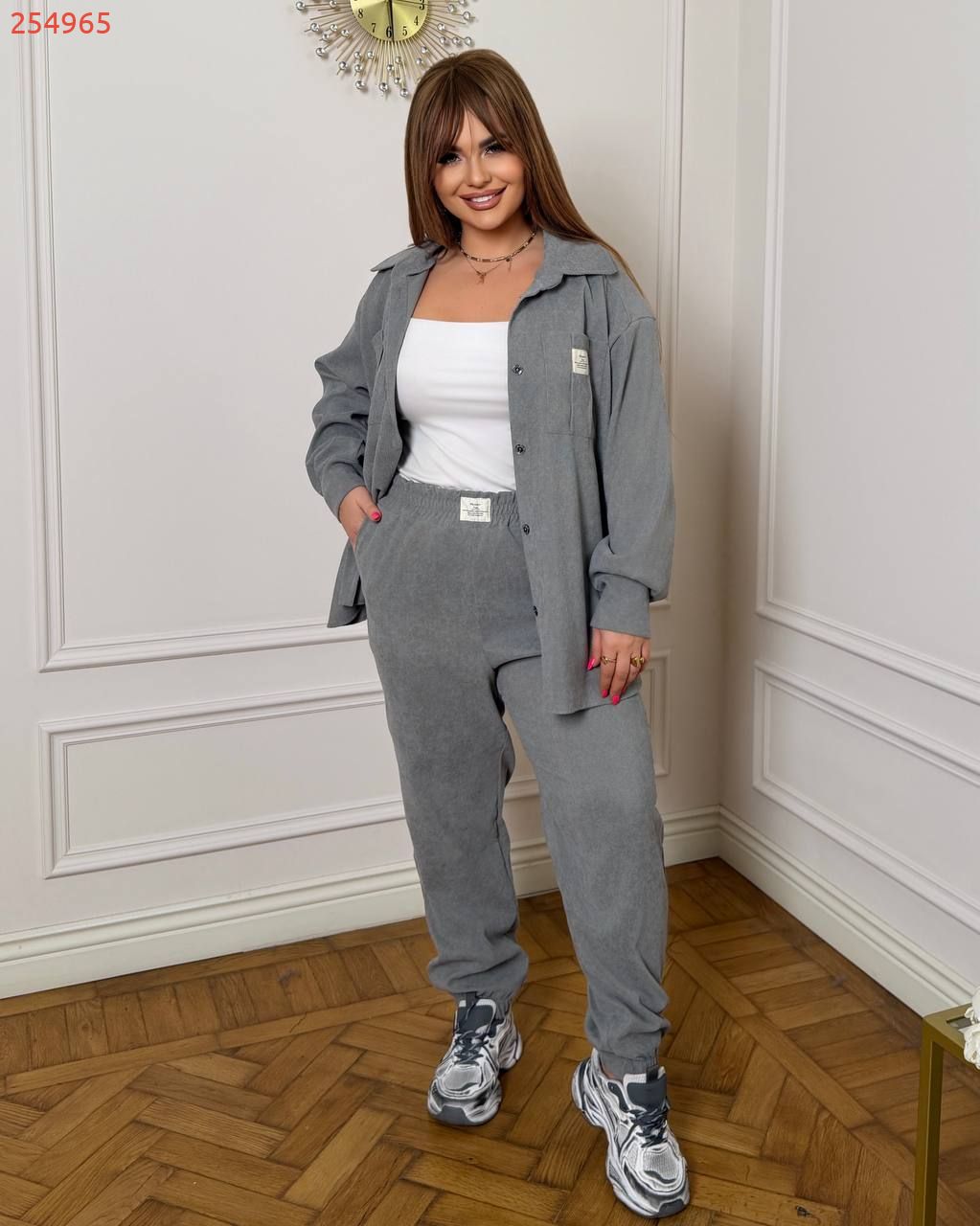 Стильний прогулянковий костюм із мікровельвету: Сорочка вільного крою на гудзиказ, з робочими кишенями + джогери з високою посадкою з кишенями у бічних швах. На поясі та знизу на гумці.