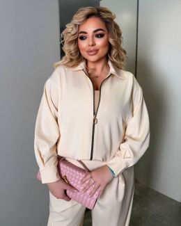 Кофта-бомбер. Вільний крій, спереду понизу мʼякі склади, позаду- на резинці, що дозволяє зробити бажану фіксацію, застібка на блискавку. Спущена лінія плеча, обʼємний рукав із манжетом.