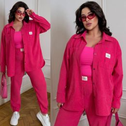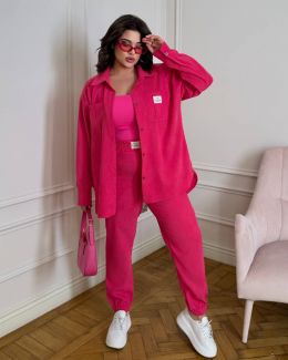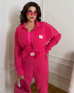 Стильний прогулянковий костюм із мікровельвету: Сорочка вільного крою на гудзиказ, з робочими кишенями + джогери з високою посадкою з кишенями у бічних швах. На поясі та знизу на гумці.
