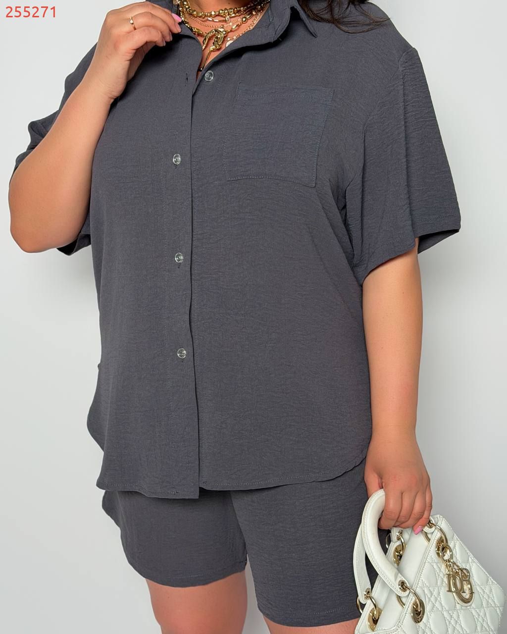 Стильний прогулянковий костюм з креп софту: Сорочка на гудзиках з кишенею , по низу з розрізами по боках + шорти з високою посадкою на гумці, з кишенями у бічних швах