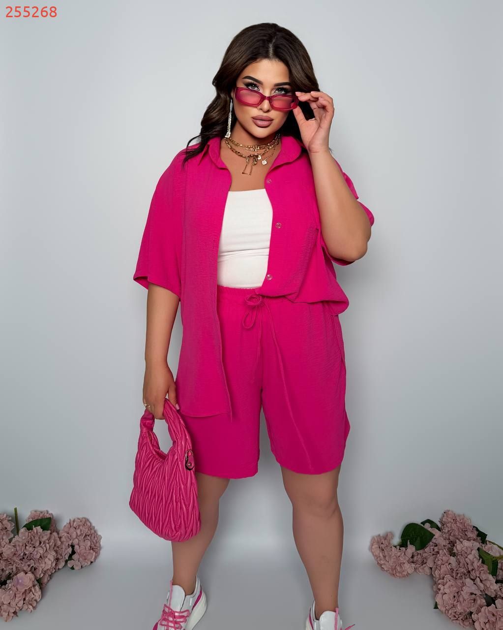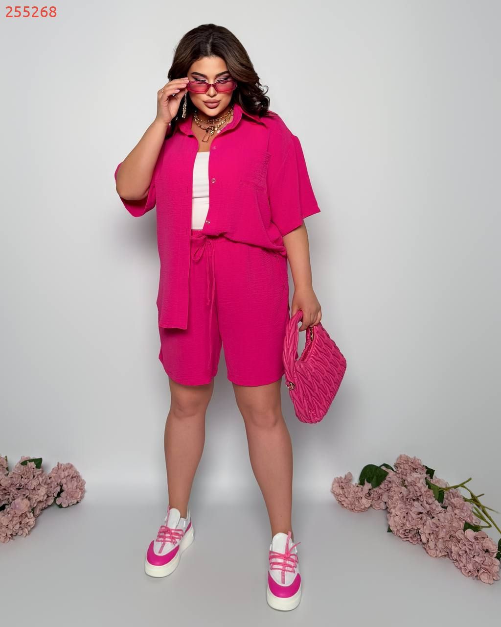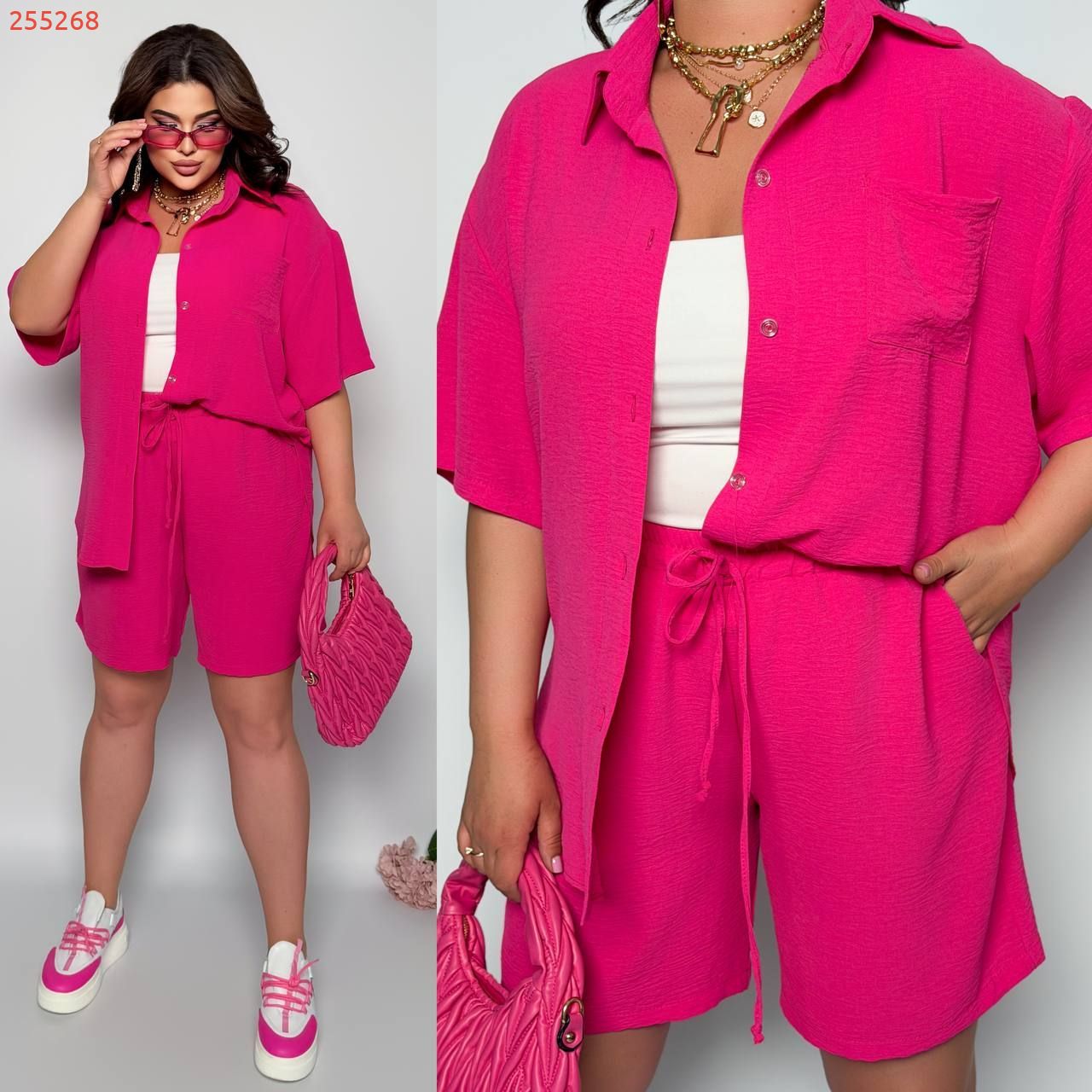 Стильний прогулянковий костюм з креп софту: Сорочка на гудзиках з кишенею , по низу з розрізами по боках + шорти з високою посадкою на гумці, з кишенями у бічних швах