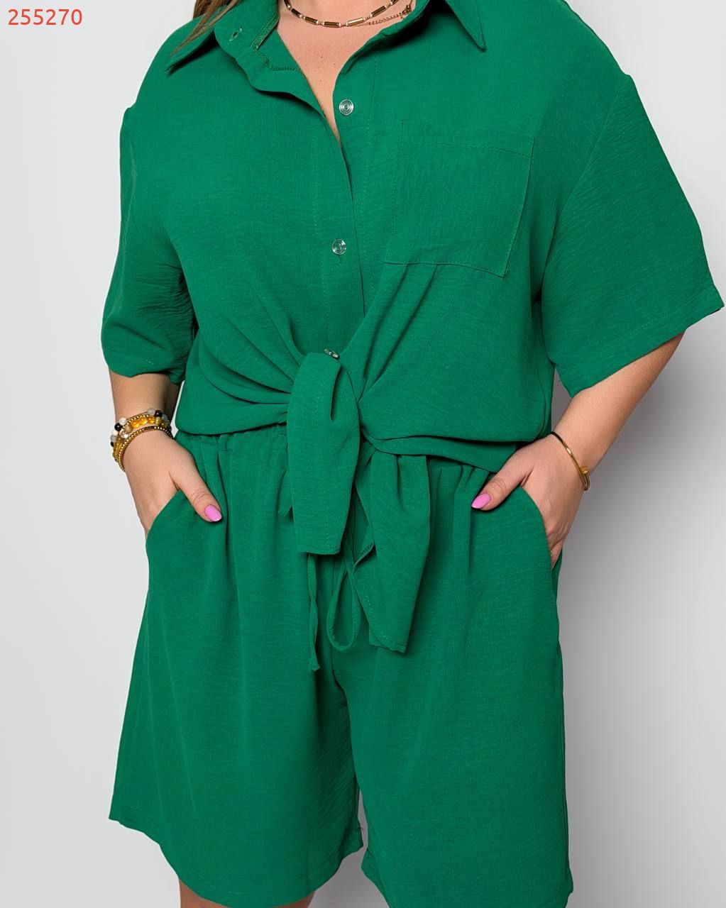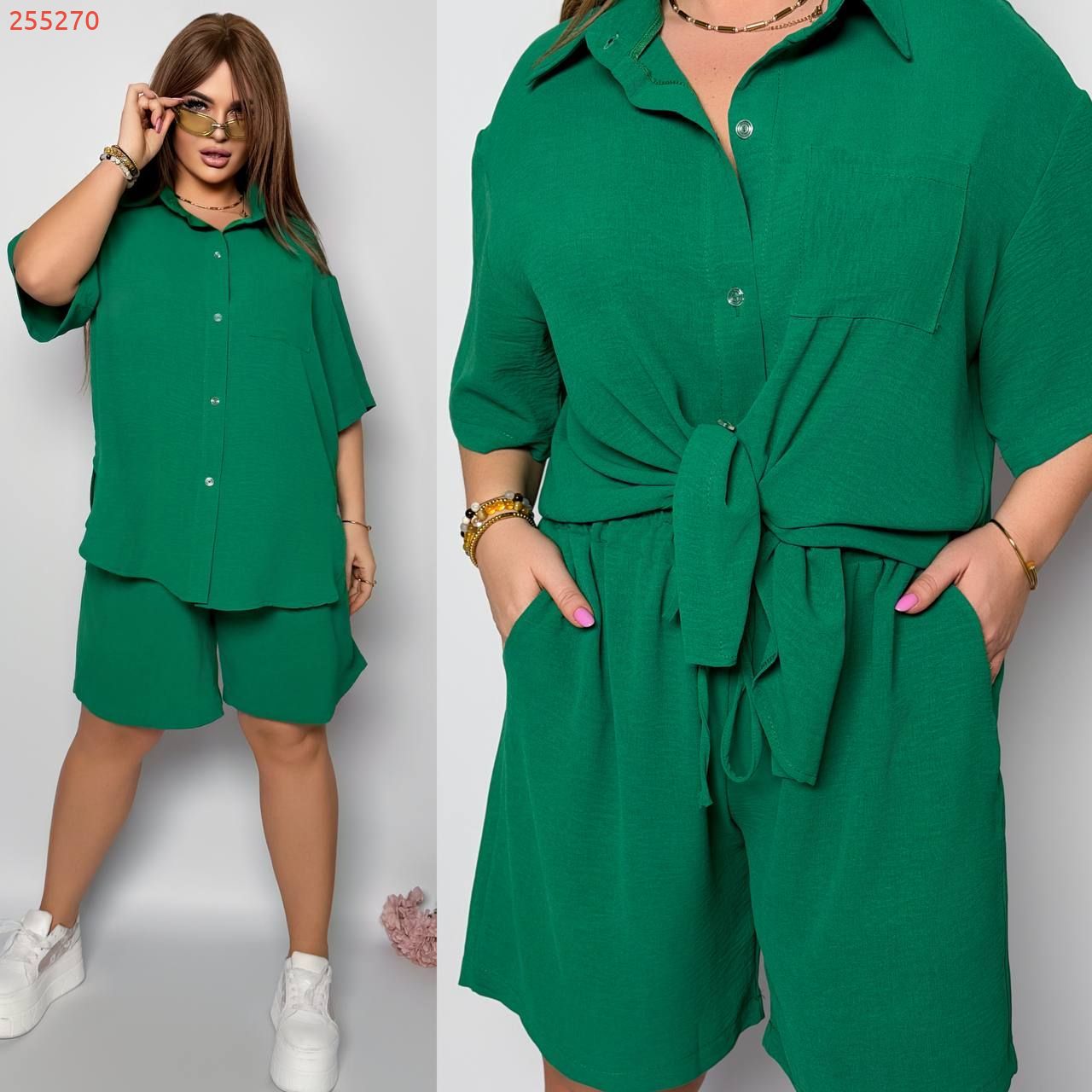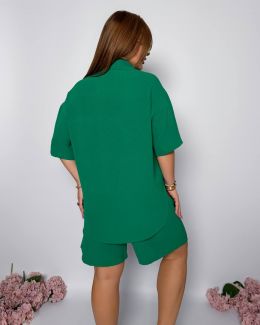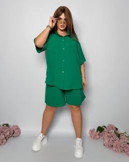 Стильний прогулянковий костюм з креп софту: Сорочка на гудзиках з кишенею , по низу з розрізами по боках + шорти з високою посадкою на гумці, з кишенями у бічних швах