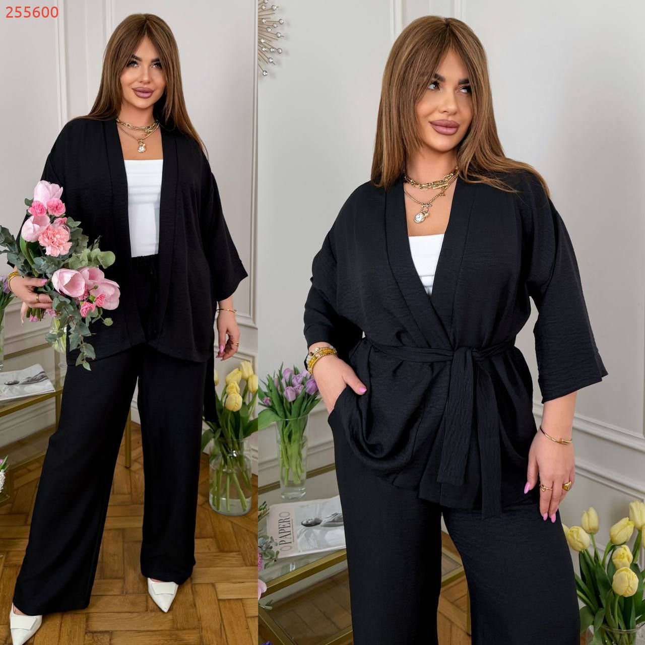 Стильний прогулянковий костюм зі льону «Бохо»: вільний кардиган під пояс + Штани з високою посадкою на гумці, з кишенями у бічних швах та куліскою на поясі.