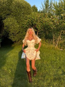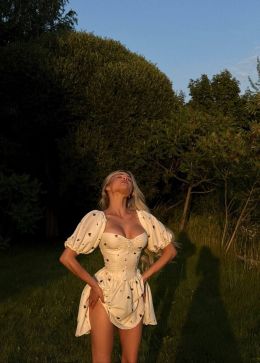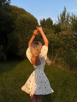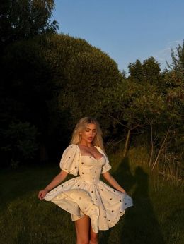 Модель стилізована обʼємним рукавчиком та пишною спідницею . Сукня має завʼязки на спинці, за допомогою яких можна регулювати обьєм декольте