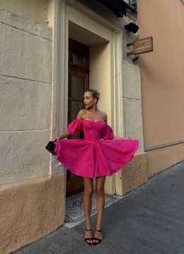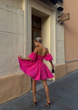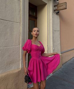 Модель стилізована обʼємним рукавчиком та пишною спідницею . Сукня має завʼязки на спинці, за допомогою яких можна регулювати обьєм декольте