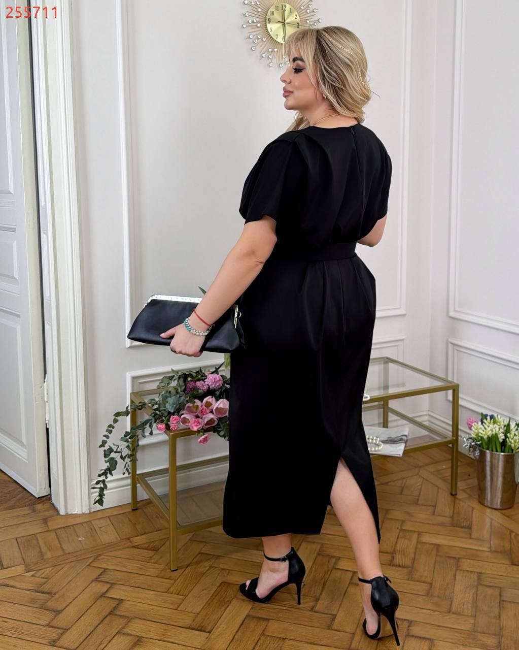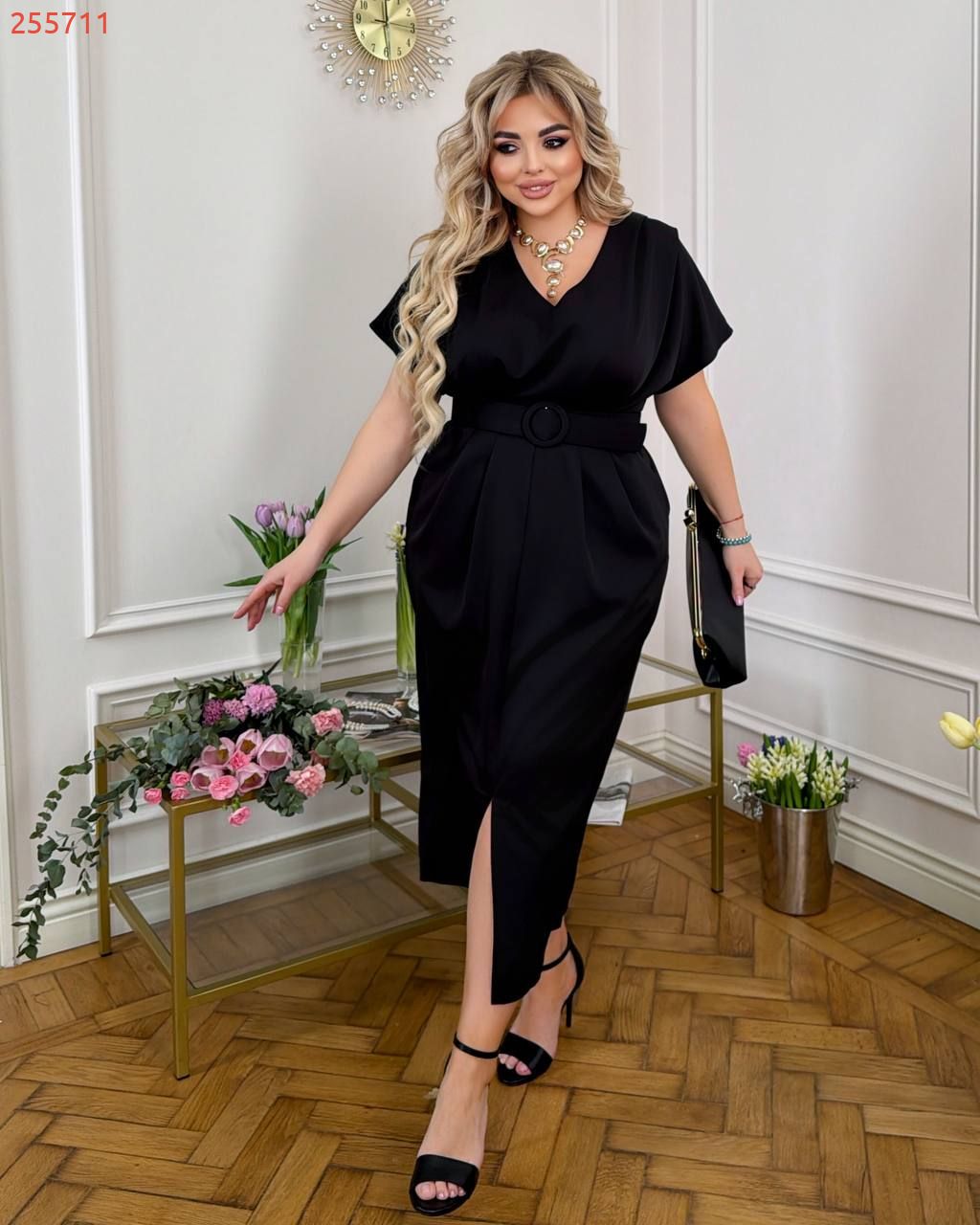 Плаття з v-образним вирізом, спереду та ззаду по низу розрізи, з боків кишені , ззаду по спинці молнія , рукав прикриває біцепс, пояс виготовлений з основної тканини ( входить в комплект).