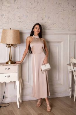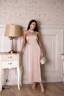 Елегантна шовкова сукня максі зі стійкою та акцентом на відкритій спині. Струменева тканина підкреслює силует, а зав'язки на шиї додають витончену деталь. Лаконічний крій робить модель ідеальною для вечора, зйомки або урочистого виходу.