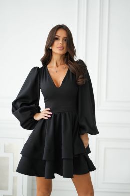 Неймовірна сукня приталеного силуету з подвійною спідницею. Верх сукні з глибоким V-подібним вирізом та довгими пишними рукавами. Манжет на резинці. Об'ємна спідниця оброблена криноліном, що робить її більш загадковою.
