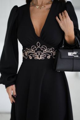 Вишукана сукня довжини міді з контрастною вишивкою на талії. Глибокий V-подібний виріз візуально подовжує шию та додає образу нотку романтичності, а довгі рукави з легким об’ємом надають м'якості та плавності лініям.