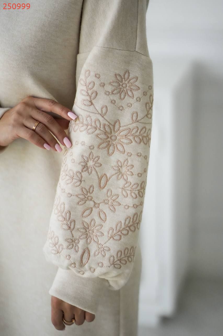 Трикотажна сукня з високим горлом і вишитими рукавами – ідеальне поєднання тепла та елегантності.
