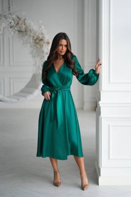 Довгі рукави з манжетами надають образу ніжності, а струмлива тканина красиво грає на світлі, створюючи ефект дорогоцінного шовку.