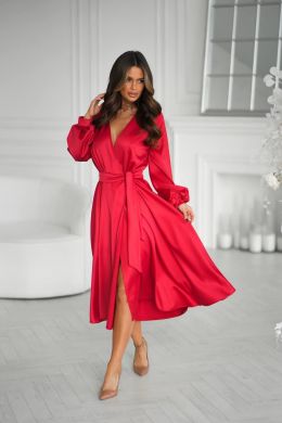 Глибоке V-подібне декольте в поєднанні із запахом м’яко акцентує лінію талії, а пояс додає силуету витонченості.