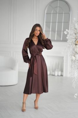 Довгі рукави з манжетами надають образу ніжності, а струмлива тканина красиво грає на світлі, створюючи ефект дорогоцінного шовку.