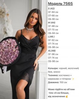 Верх моделі – на запах, м’яко підкреслює декольте, а глітерна мереживна вставка додає образу ефектного сяйва.