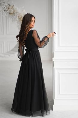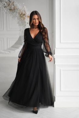 Витончена довга сукня з м’якою сіткою та високим розрізом на нозі. Модель має V-подібний виріз на грудях на запах, що формує жіночну та виразну лінію декольте.