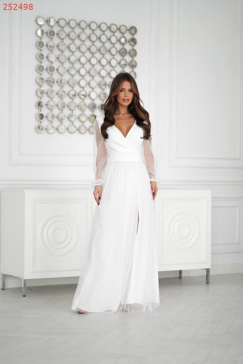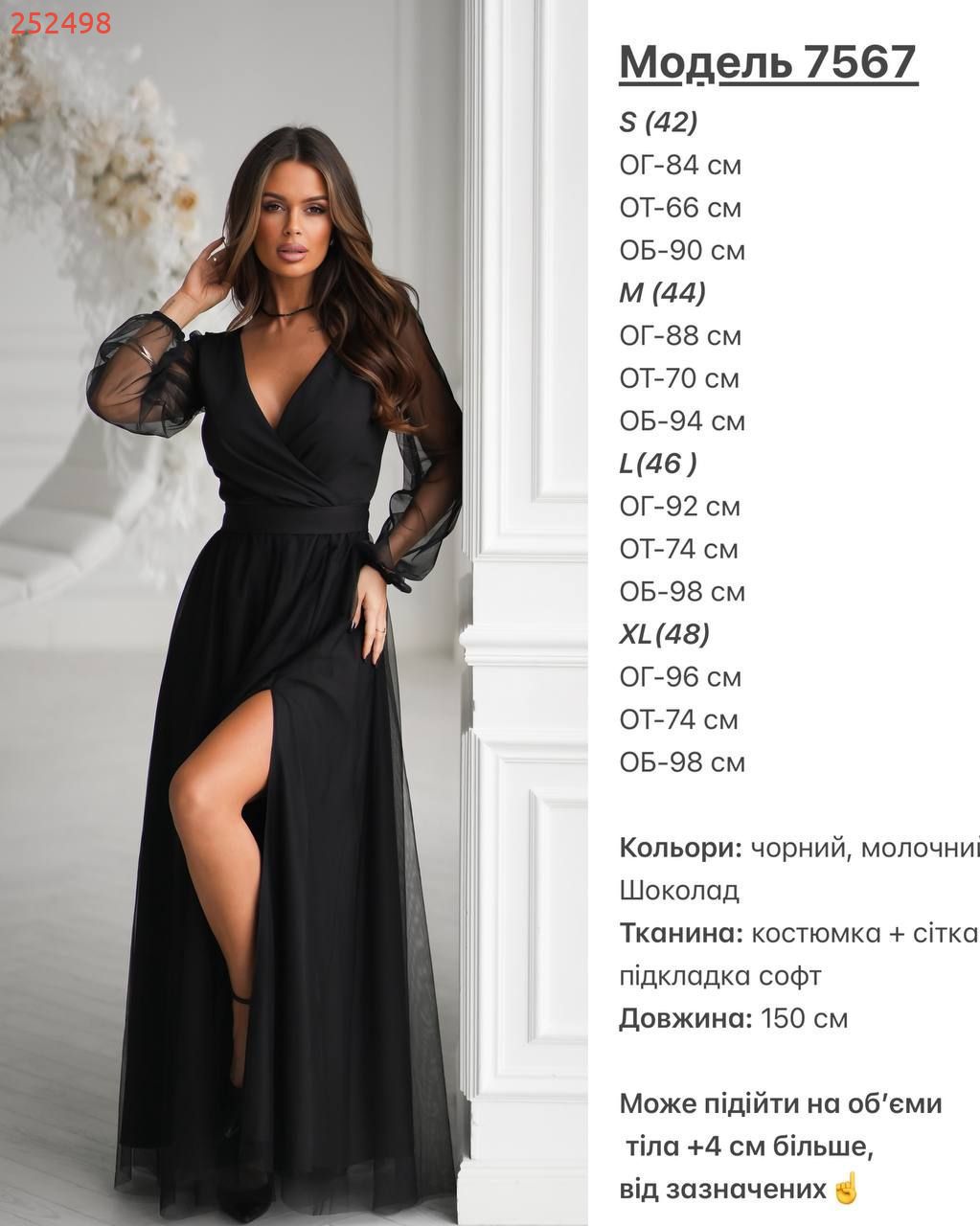 Витончена довга сукня з м’якою сіткою та високим розрізом на нозі. Модель має V-подібний виріз на грудях на запах, що формує жіночну та виразну лінію декольте.