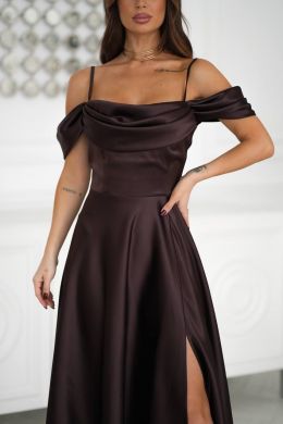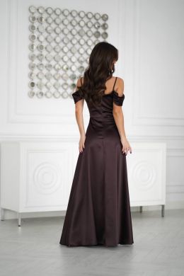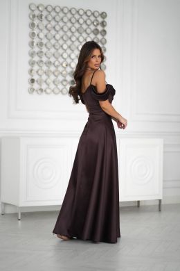 Атласна сукня зі спущеними рукавамина брителях, озлобленна драпіруванням у зоні декольте, що надає образу витонченості та жіночності. Сукня ідеально підходить для особливих випадків, таких як весілля, вечірки або фотосесії.
