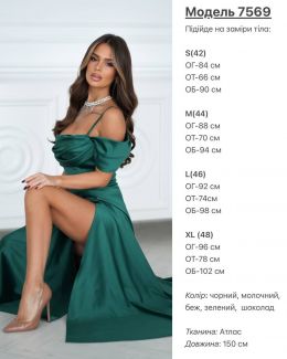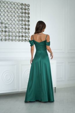 Атласна сукня зі спущеними рукавамина брителях, озлобленна драпіруванням у зоні декольте, що надає образу витонченості та жіночності. Сукня ідеально підходить для особливих випадків, таких як весілля, вечірки або фотосесії.