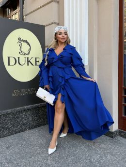 Довжина 143см, одягається на запах. Ідеальна посадка. Спідниця-напівсонце – не повнить. Легке, приємне до тіла. Прикрашення- паси - Тренд цього сезону. Вони роблять сукню повітряною , додають шарму