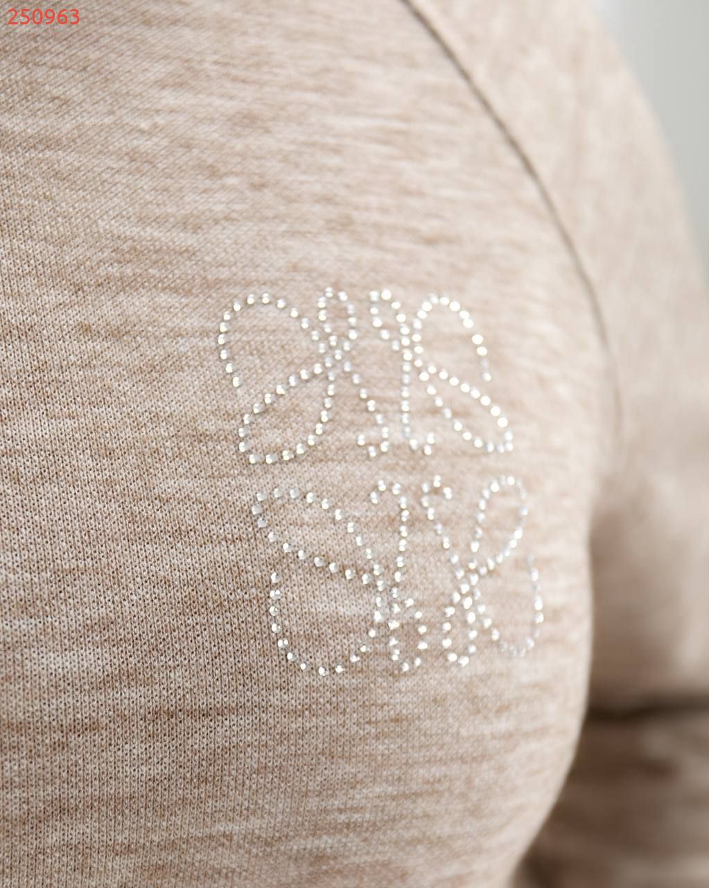 Сукня вільного крою, на грудях- прикраса зі страз, рукав реглан, з кишенями, знизу з розрізами на кнопках.