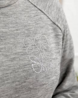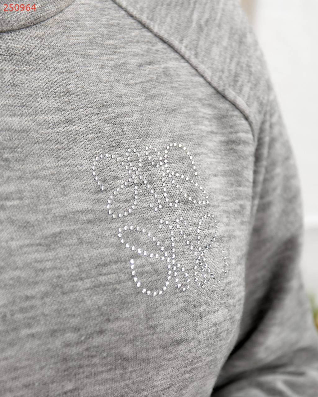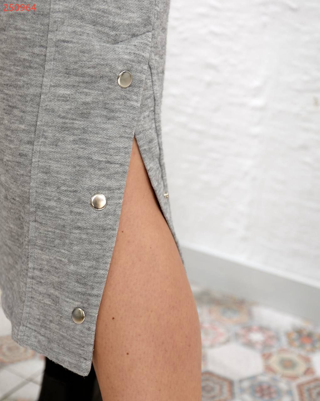 Сукня вільного крою, на грудях- прикраса зі страз, рукав реглан, з кишенями, знизу з розрізами на кнопках.