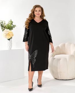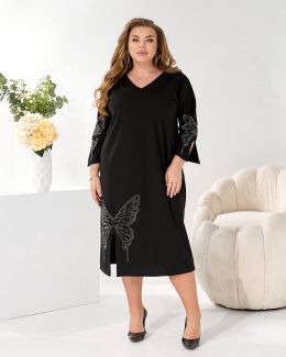 Представляємо елегантну сукню міді, виконану у вільному, прямому крої з V-подібним вирізом, що гарантує ідеальну посадку на будь-яку фігуру.