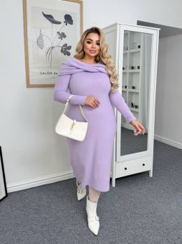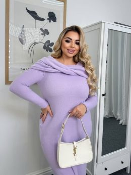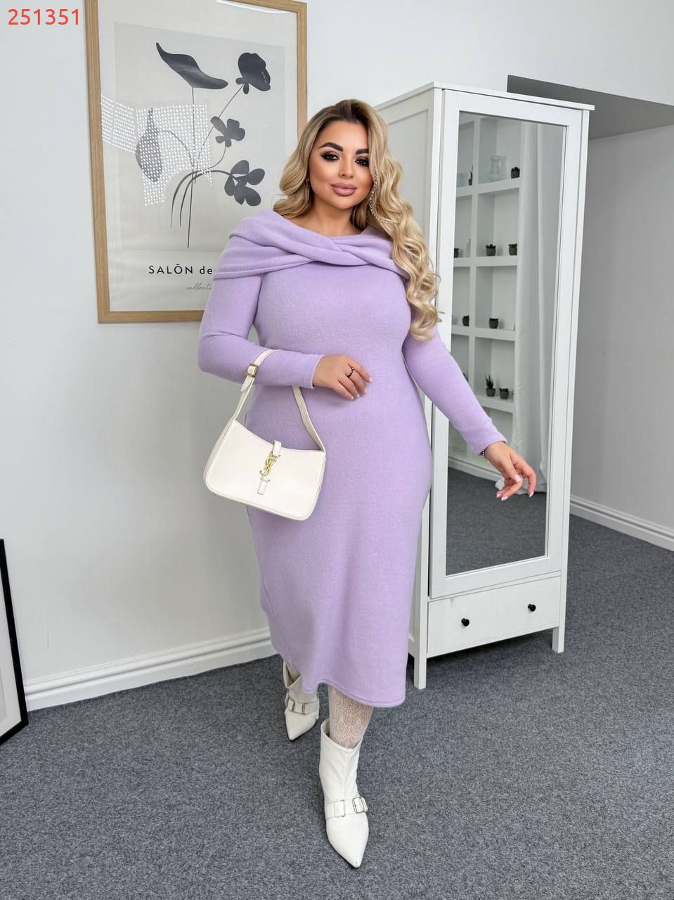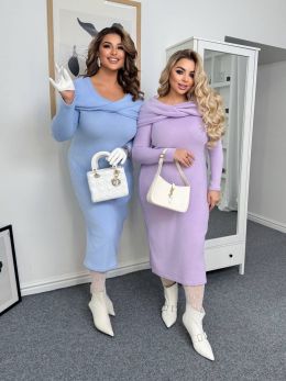 Модель має силует, що облягає, довжиною міді, підкреслюючи фігуру. Верх прикрашений оригінальним коміром-хомутом, який м'яко драпірується і надає образу жіночності та затишку. Рукави довгі, без манжет. Елегантний, але комфортний повсякденний образ у стилі casual chic.
