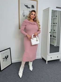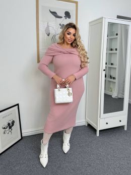 Модель має силует, що облягає, довжиною міді, підкреслюючи фігуру. Верх прикрашений оригінальним коміром-хомутом, який м'яко драпірується і надає образу жіночності та затишку. Рукави довгі, без манжет. Елегантний, але комфортний повсякденний образ у стилі casual chic.