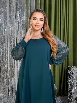 Силует сукні у вигляді трапеції, завдяки чому чудово маскує будь-які недоліки фігури та підкреслює її переваги. Виріз горловини круглий. Рукави на манжетах, виконані із гарного гіпюру в тон основної тканини. Низ сукні асиметричний. Застібок кишень немає.