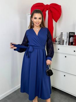 Неймовірно жіночна ошатна сукня у вечірньому стилі, довжиною міді. Сукня виконана із тканини софт (розтяжності немає). Ліф та спідниця мають запАх, по талії зібрано на резинку. Рукави виготовлені із дуже гарного гіпюру, на манжеті. Пояс із основної тканини в комплекті. Кишень та застібок немає