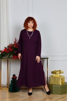 Силует сукні довгий, напівприталений. Виріз горловини круглий, рукави повної довжини. Лінія талії відрізна, трохи занижена, спідниця із защипами, в бічних швах оброблені кишені. Застібки немає. Внизу з боків розрізи, що додає образу жіночності. Сукня добре приховує будь-які недоліки та робить силует стрункішим. Ідеально підійде як для повсякденних справ, так і на свята, якщо додати аксесуарів.