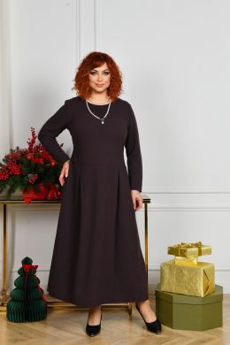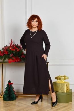 Силует сукні довгий, напівприталений. Виріз горловини круглий, рукави повної довжини. Лінія талії відрізна, трохи занижена, спідниця із защипами, в бічних швах оброблені кишені. Застібки немає. Внизу з боків розрізи, що додає образу жіночності. Сукня добре приховує будь-які недоліки та робить силует стрункішим. Ідеально підійде як для повсякденних справ, так і на свята, якщо додати аксесуарів.