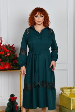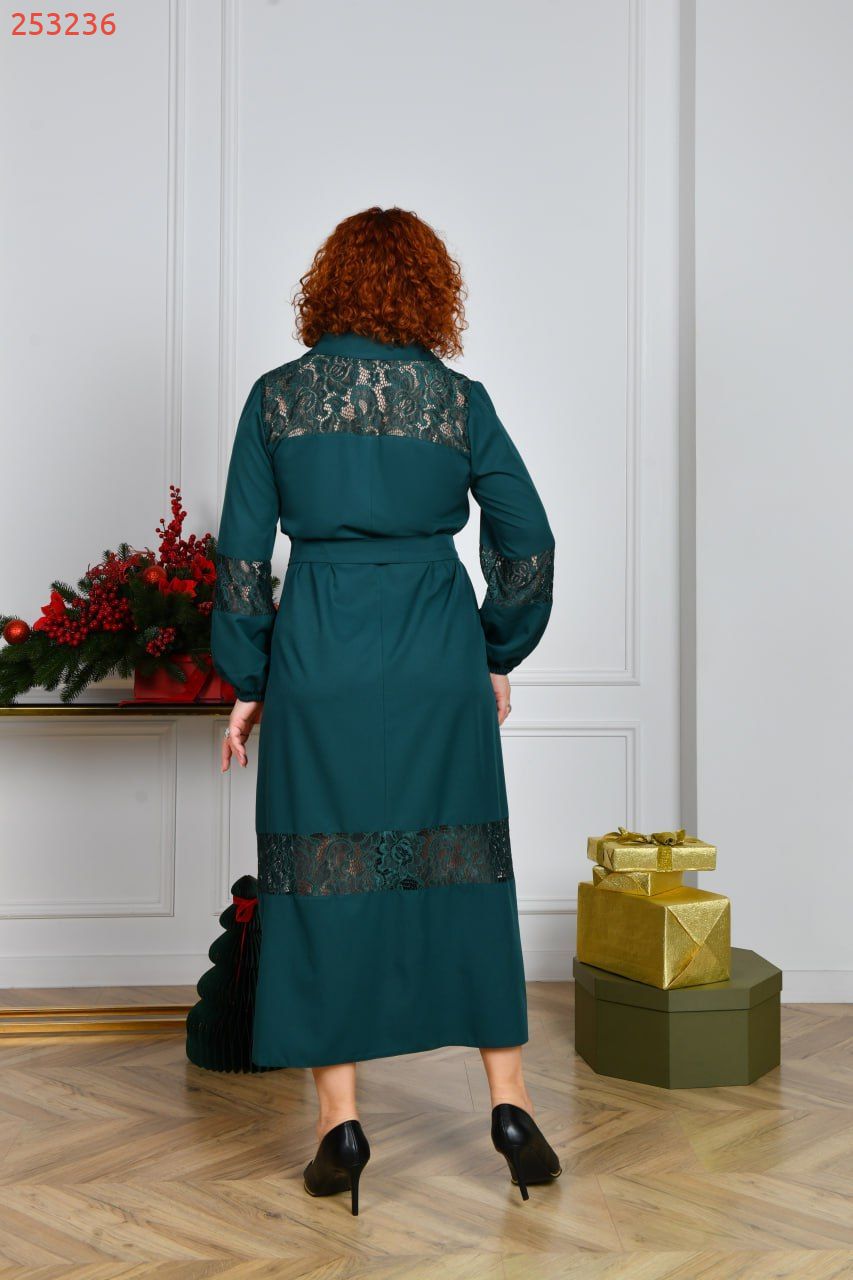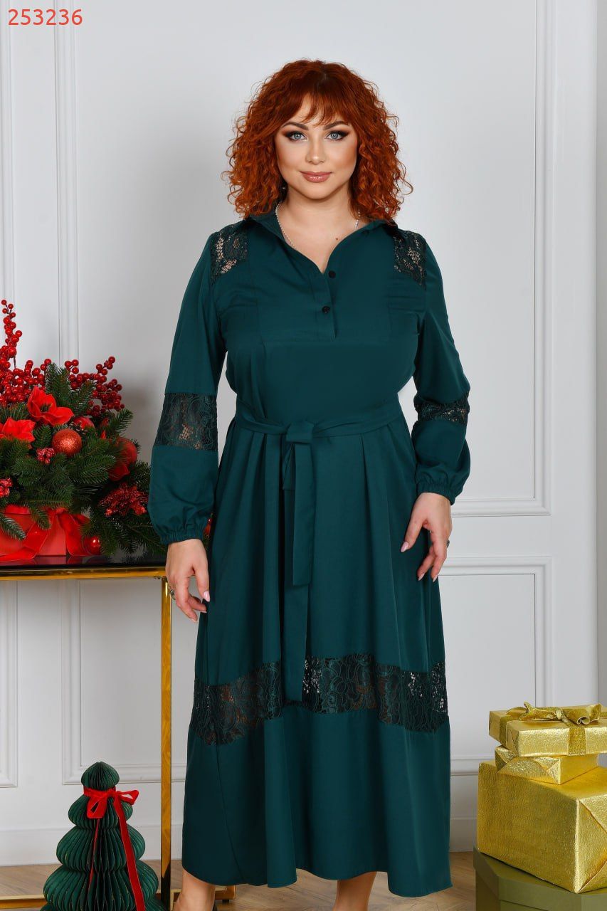 Силует у вигляді трапеції, талію можна падкреслити за допомогою поясу із основної тканини. По горловині стояче-відкладений комірець, попереду коротка планка із гудзиками. Рукави довгі, по низу на резиночці. Сукня декорована дуже якісним та гарним гіпюром. Кишень немає. Можна носити з поясом та без нього.