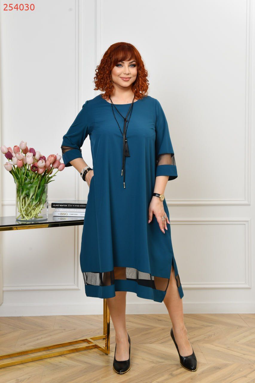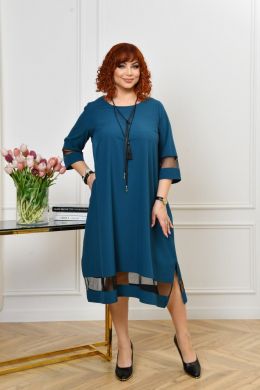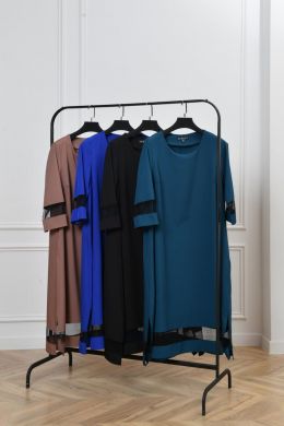 Сукня має А-подібний силует, та чудово приховує будь-які недоліки фігури. Виріз горловини круглий, рукав довжиною 3/4. Низ сукні та рукави мають декоративні вставки із мʼякої сіточки. З боків внизу є розрізи. В бічних швах оброблені кишені. Сукня ідеально підійде як для свят, так і на кожен день.